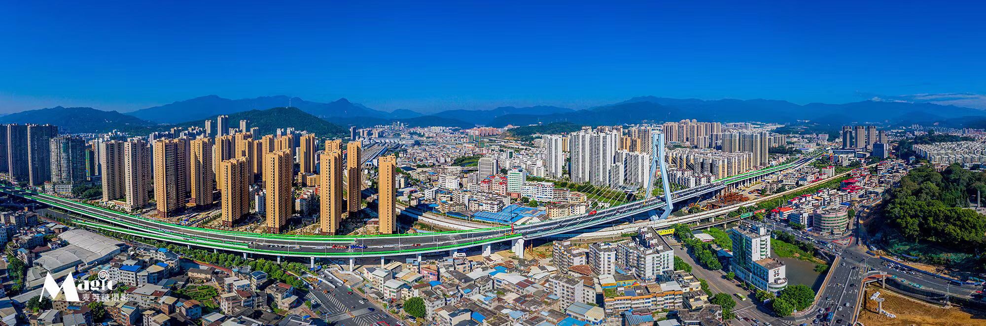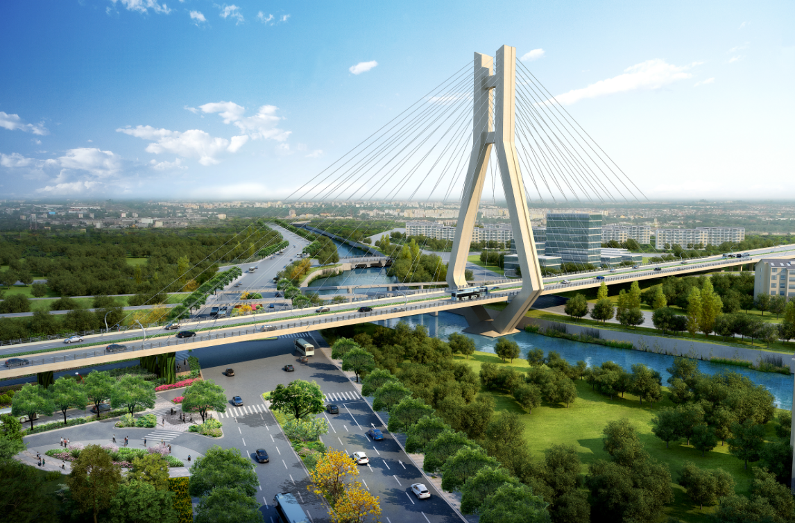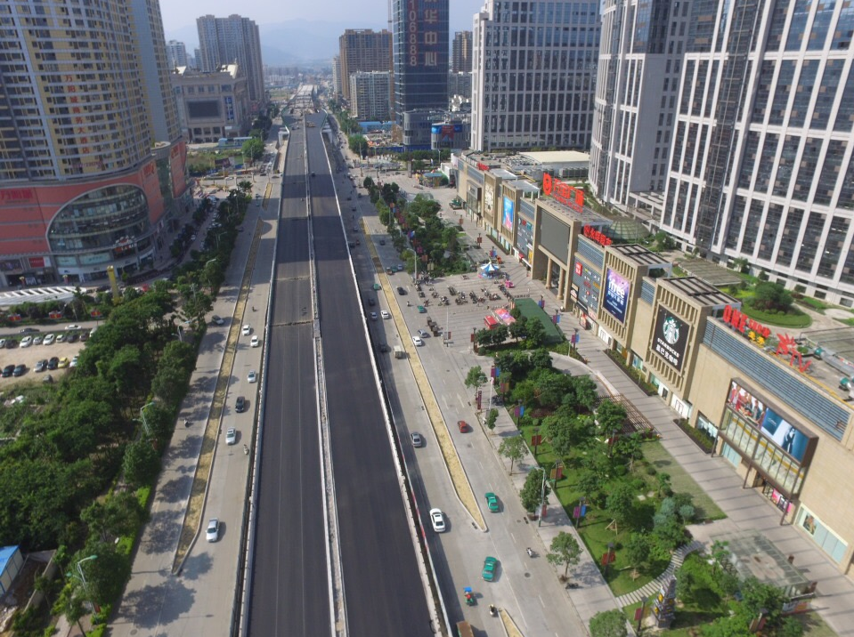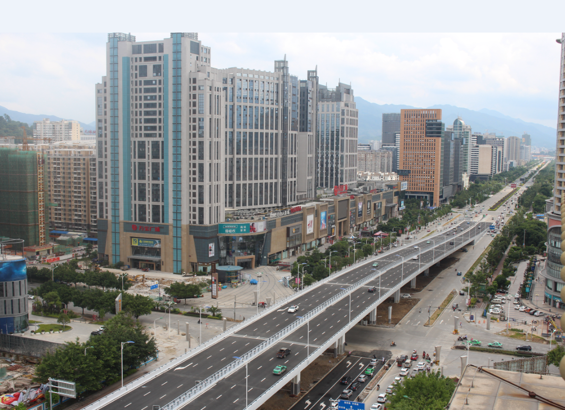 龍巖大道高架橋項目為省、市重點建設項目,是龍巖中心城市連接南北、溝通新老城區的重要樞紐,項目位于龍巖市南北交通中心軸和景觀軸線龍巖大道上,全長3395m,包含橋梁和地面道路兩大部分,其中橋梁工程總長2329m,橋寬26m,包含一座190+150m獨塔斜拉索鋼箱梁主橋(主橋寬36.3m),全線設計為雙向六車道,設計車速60km/h,在西陂路及人民路處各設置上下匝道,跨越雙洋路、羅龍東路、人民路、登高西路、西陂路城市主干道,項目總投資約24億元。